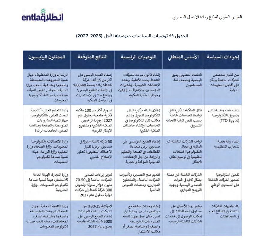 أوصى تقرير السنوي «انطلاق» على ضرورة سن قانون مخصص للشركات الناشئة مستند إلى أفضل الممارسات الدولية، و إنشاء الهيئة الوطنية لنقل وتسويق التكنولوجيا (TTO Egypt)، فضلا عن إنشاء بيئة رقمية للتجارب التنظيمية في القطاعات عالية النمو بما يعزز من قدرة الشركات الناشئة على النمو والتوسع بشكل مستدام.