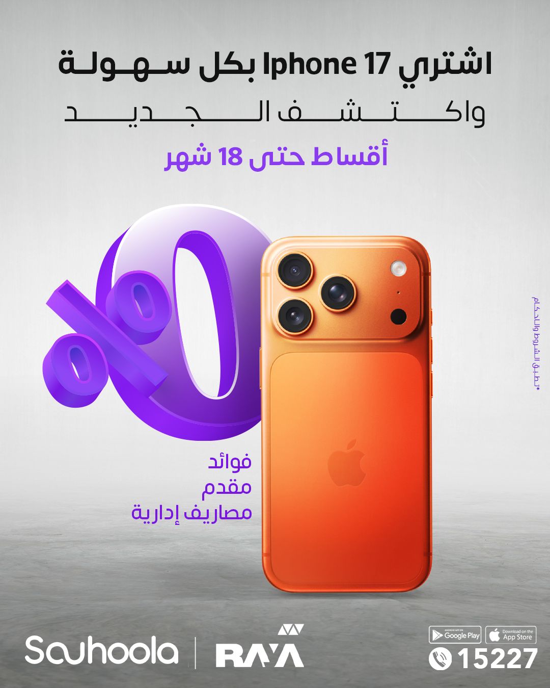 الرئيسية » بدون «مقدم» أو «فوائد» أو «مصاريف إدارية»..«سهولة» تطلق عرضًا حصريًا بالتعاون مع «Raya» على «iPhone 17» بالقسط حتى 18 شهرا