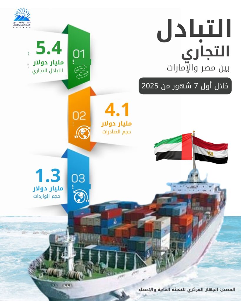 كشف الجهاز المركزي للتعبئة العامة والإحصاء، عن ارتفاع حجم التبادل التجاري بين مصر والإمارات ليصل إلى 5.4 مليار دولار خلال الفترة من يناير حتى يوليو 2025، مقابل 3.2 مليار دولار خلال نفس الفترة من عام 2024، بنسبة زيادة قدرها 71%.