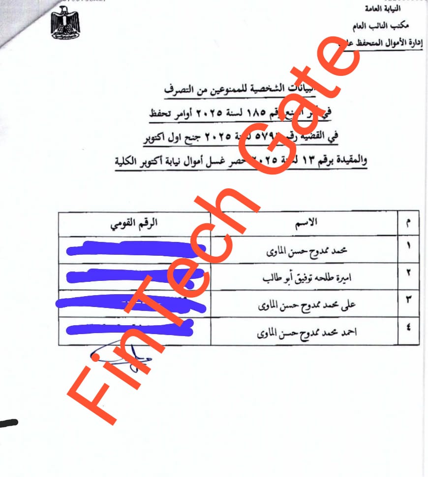 ويتضمن القرار الصادر بتاريخ 29 سبتمبر 2025 منع المشمولين به “مؤقتًا” من التصرف في أموالهم الشخصية فقط، سواء كانت نقدية أو منقولة أو سائلة أو في صورة أسهم وسندات وصكوك وخزائن وودائع ومحافظ إلكترونية، بالإضافة إلى أموالهم العقارية، وذلك بجميع البنوك والشركات داخل جمهورية مصر العربية. ويستثني القرار أرصدة الشركات التي يساهمون فيها.