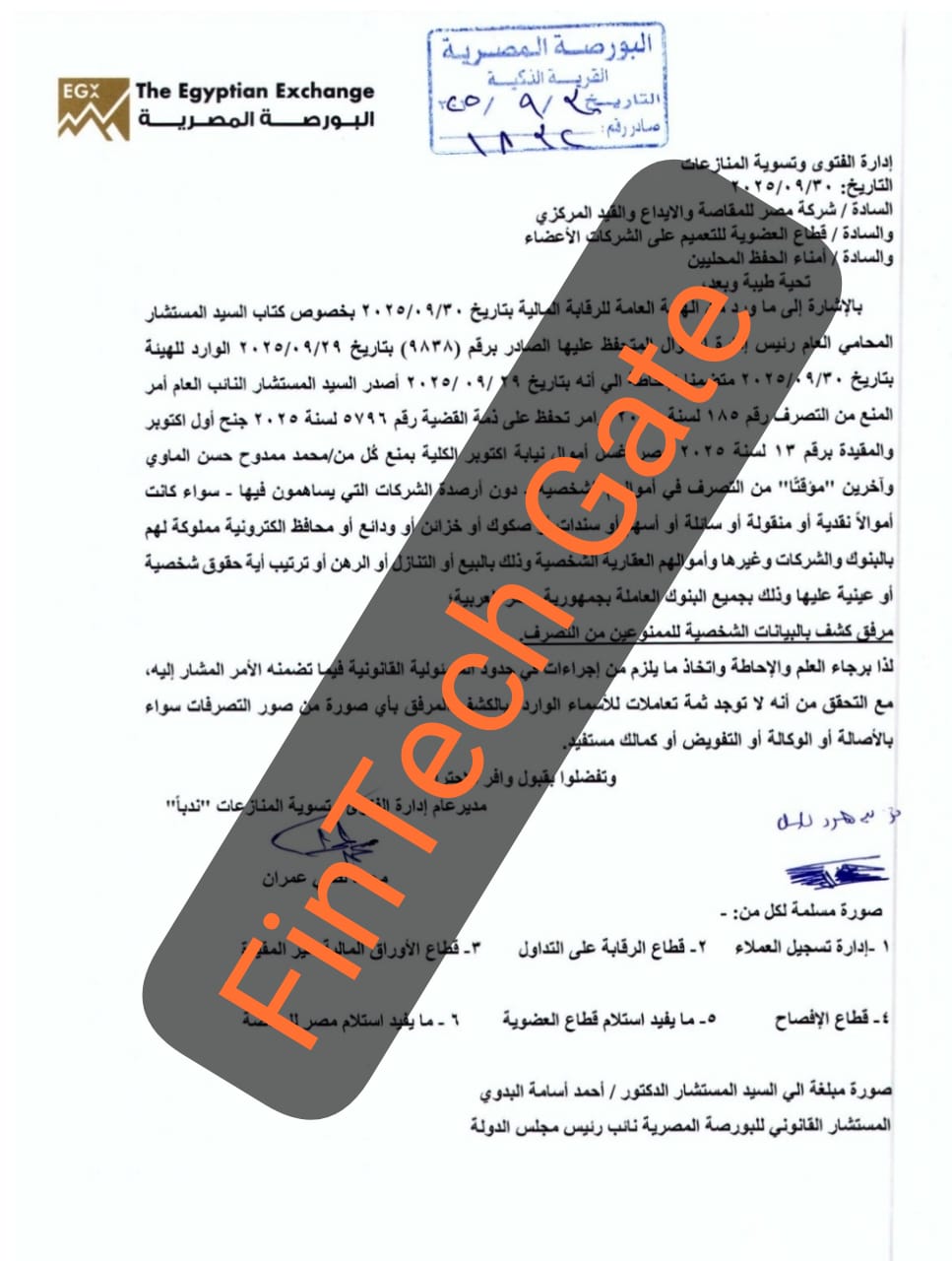 وتم تعميم القرار على شركة مصر للمقاصة والإيداع والقيد المركزي، وقطاع العضوية للتعميم على الشركات الأعضاء، وأمناء الحفظ المحليين، للتأكد من عدم وجود أي تعاملات أو تصرفات تخص الأسماء الواردة بالكشف المرفق سواء بالأصالة أو الوكالة أو التفويض أو بصفة مالك مستفيد.
