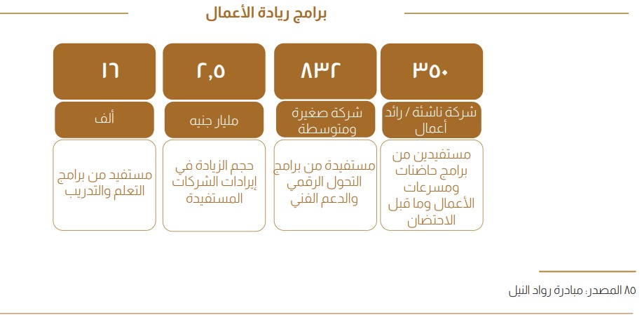 وساهمت مراكز المبادرة في توفير حوالي 765 ألف خدمة غير مالية واستشارية لأكثر من 318 ألف مستفيد ما بين رواد أعمال وأصحاب مشروعات ناشئة وصغيرة ومتوسطة، فضلًا عن تيسير حصول 11.7 ألف عميل على تسهيلات بقيمة 12.6 مليار جنيه بنهاية عام 2024.