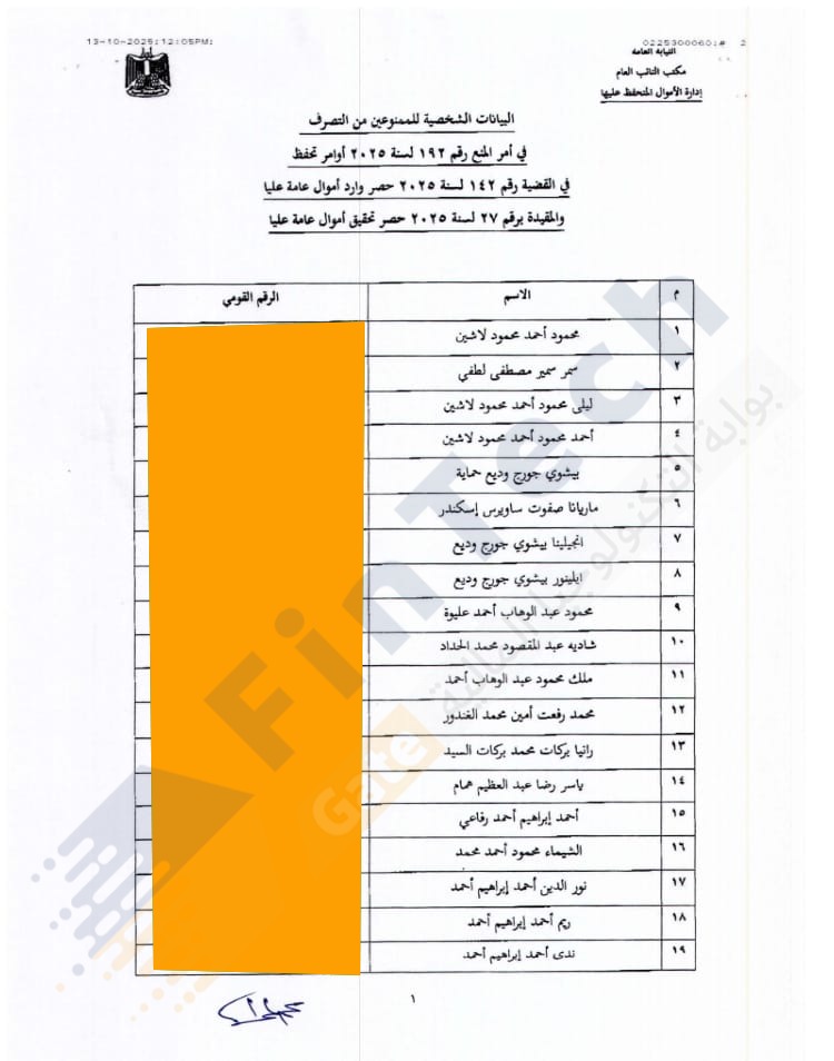 كما أرفقت الهيئة العامة للرقابة المالية كشفًا تفصيليًا بالبيانات الشخصية للأسماء الصادر بشأنهم أمر المنع، مطالبة الجهات المعنية باتخاذ ما يلزم من إجراءات قانونية في ضوء القرار، مع التحقق من عدم وجود أي تعاملات مالية أو تصرفات باسم أي من المشمولين سواء بالأصالة أو بالوكالة أو التفويض أو بصفتهم ملاكًا مستفيدين.
