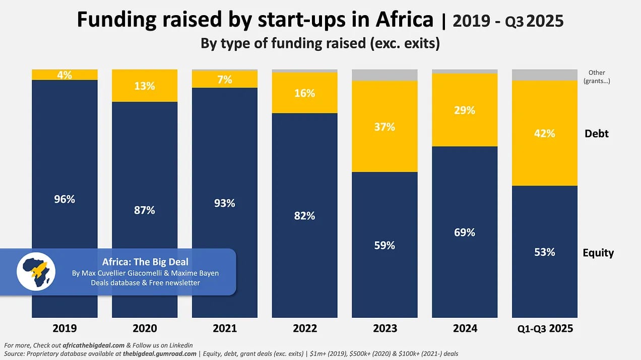 أكد التقرير أن التمويل بالديون أصبح المحرك الأبرز في السوق الأفريقية، إذ جمعت الشركات الناشئة حتى الآن 935 مليون دولار عبر أدوات الدين، متجاوزة مستويات 2024 و2022، ومقتربة من الرقم القياسي المسجل عام 2023 والبالغ 1.1 مليار دولار.