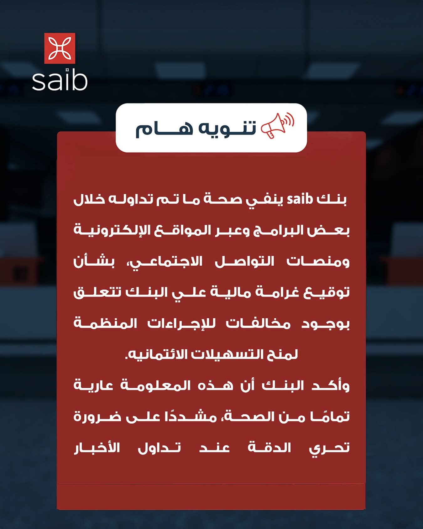 نفى بنك «saib» ما تم تداوله عبر بعض البرامج والمواقع الإلكترونية ومنصات التواصل الاجتماعي حول توقيع غرامة مالية على البنك بدعوى وجود مخالفات في الإجراءات المنظمة لمنح التسهيلات الائتمانية.