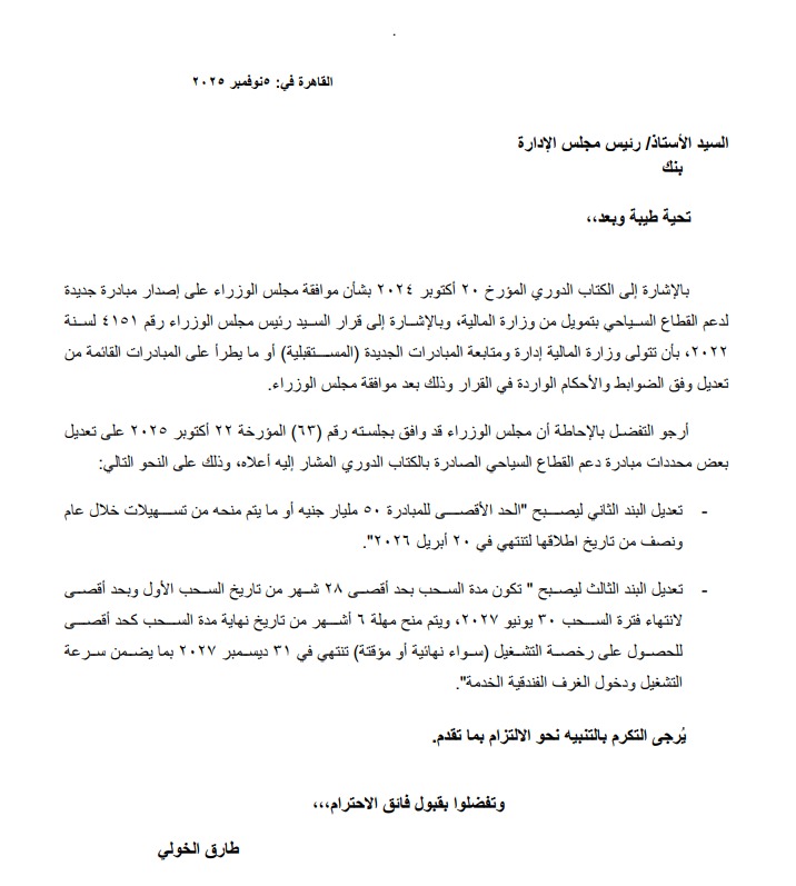 أصدر البنك المركزي المصري كتابًا دوريًا بتاريخ 5 نوفمبر 2025 بشأن موافقة مجلس الوزراء على مد العمل بمبادرة دعم القطاع السياحي وتمديد بعض محدداتها. وذلك في إطار استمرار جهود الدولة لتعزيز أنشطة السياحة ودعم استثماراتها بما يتماشى مع خطة الحكومة لتنشيط القطاع كأحد أهم روافد الاقتصاد القومي.