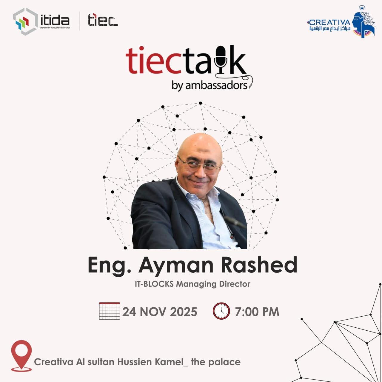أعلنت هيئة تنمية صناعة تكنولوجيا المعلومات «إيتيدا» عن استضافة المهندس أيمن راشد، مؤسس شركة Otlob.com والرئيس التنفيذي لشركة IT_Blocks، في جلسة جديدة من برنامج TIEC Talk لشهر نوفمبر، والتي تُقام يوم الاثنين 24 نوفمبر الحالي في كرياتيفا قصر السلطان حسين كامل، تحت عنوان “قفل الدايرة – Closing the Circle”.