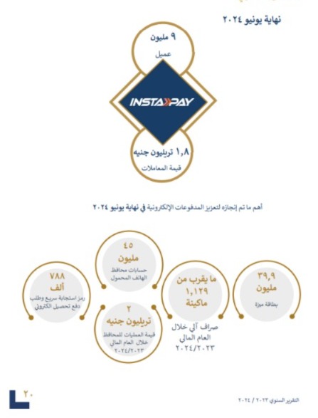 كما استعرض المركزي أهم ما تم إنجازه لتعزيز المدفوعات الإلكترونية، حيث تم إصدار 39.9 مليون بطاقة ميزة، ونشر مايقرب من 1129 ماكينة ATM خلال العام المالي 2023/2024، فضلاً عن نشر 788 ألف رمز استجابة سريع وطلب دفع تحصيل الكتروني.