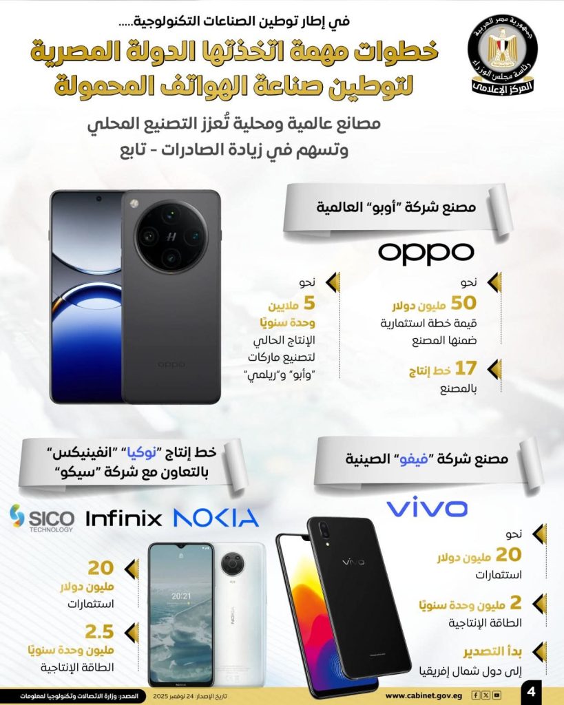 وأشارت الإنفوجرافات إلى مصنع شركة “فيفو” الصينية للهواتف الذكية، باستثمارات تصل لنحو 20 مليون دولار. وبطاقة إنتاجية 2 مليون وحدة سنويًا، كما بدأ في تصدير منتجاته إلى دول شمال إفريقيا. إلى جانب ذلك بدأ خط إنتاج “نوكيا – إنفينيكس” بالتعاون مع شركة “سيكو” عمله باستثمارات 20 مليون دولار، وبطاقة إنتاجية 2.5 مليون وحدة سنويًا.