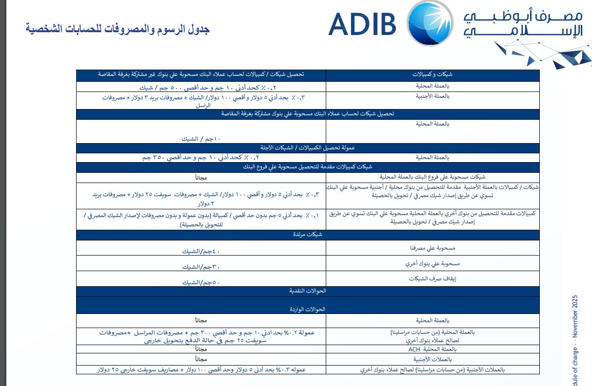 أعلن «مصرف أبوظبي الإسلامي – مصر» (ADIB) عن تحديث شامل للرسوم والمصروفات المتعلقة بخدمات الشيكات والكمبيالات، والتي دخلت حيز التنفيذ اعتبارًا من اليوم الجمعة.