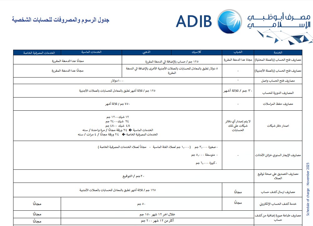 أعلن مصرف أبوظبي الإسلامي – مصر (ADIB) عن تحديث جدول الرسوم والمصروفات الإدارية المتنوعة، والتي تشمل خدمات حفظ الأمانات وإصدار الشهادات وكشوف الحسابات.