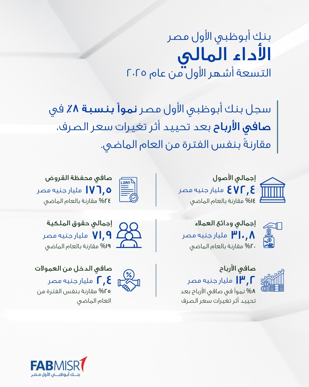 أعلن بنك أبوظبي الأول مصر، أحد أكبر البنوك العاملة في السوق المصرية، عن نتائجه المالية للتسعة أشهر من عام 2025، محققًا أداءً قويًا في عملياته المصرفية الأساسية، حيث سجل البنك نموًا بنسبة 8% في صافي الأرباح بعد تحييد أثر تغيرات سعر الصرف ليصل إلى 13.2 مليار جنيه مصري مقارنةً بالفترة نفسها من العام الماضي. وهو ما يعكس كفاءة تشغيلية عالية ونجاح الاستراتيجية المعتمدة لتعزيز القيمة المستدامة من العمليات الأساسية.